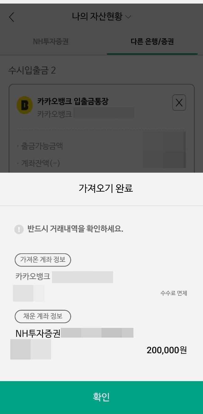 200,000원을 가져오겠는지를 다시 확인하는 창을 볼 수 있습니다. 가져올 계좌 정보와 채울 계좌 정보를 다시 확인한 후 가져오기 선택합니다. 가져오기 완료된 후 다시 nh투자증권 나무 앱에서 국내주식 잔고 확인을 해 보면 바로 입금되어 있는 것을 확인할 수 있습니다.