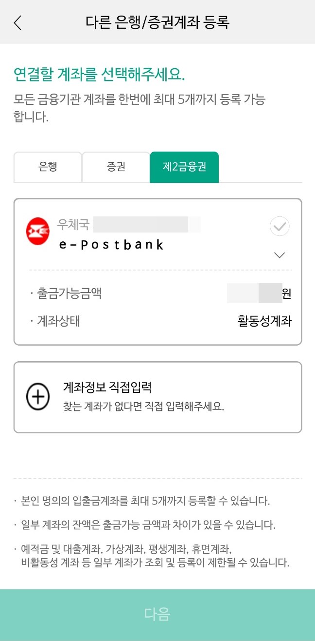 다른은행/ 증권계좌를 나무 앱에 등록하는 과정입니다. 연결할 계좌를 모두 선택할 수 있습니다. 은행을 선택하면 자신이 보유하고 있는 은행계좌가 다 검색됩니다. 증권사나 제2금융권 또한 마찬가지로 보유하고 있는 계좌는 모두 검색이 되므로 그 중에서 선택하면 됩니다.