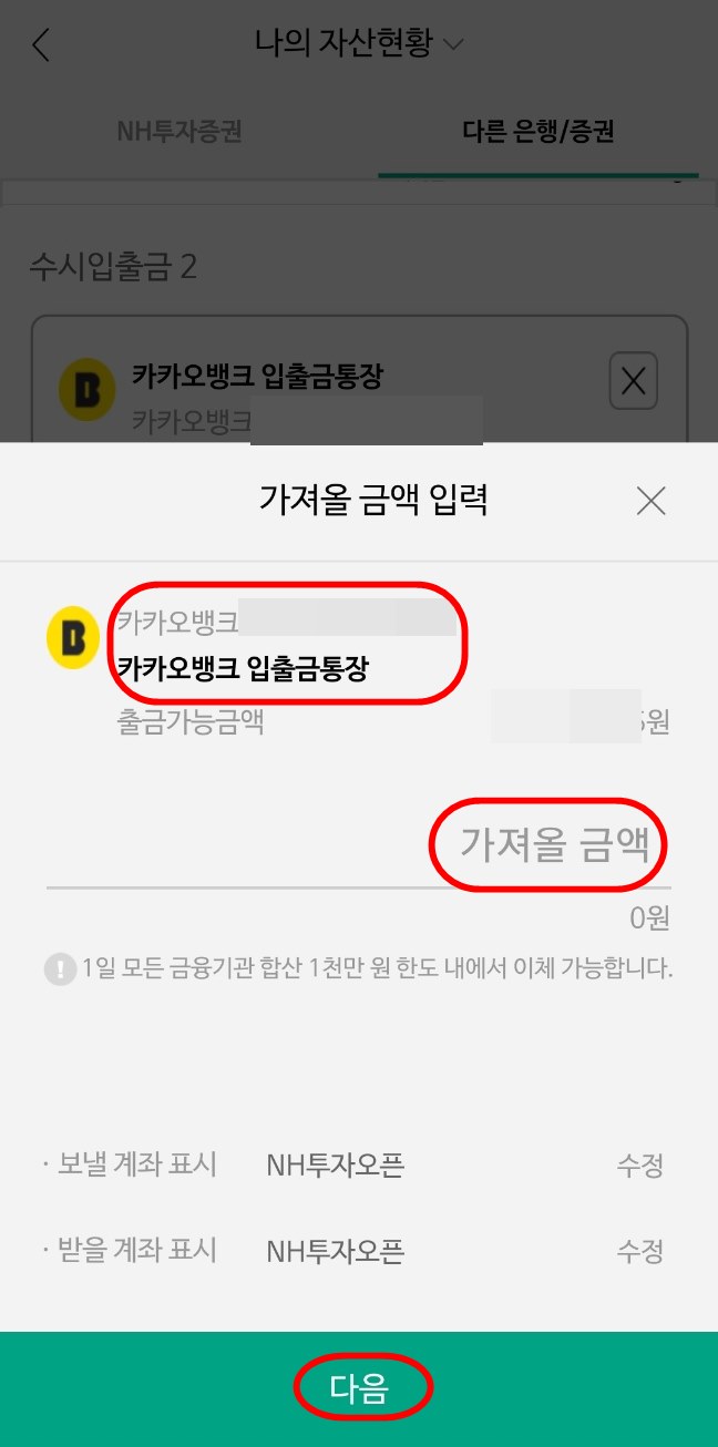 nh투자증권 계좌로 카카오뱅크에서 200,000원을 가져오기 합니다. 가져올 금액을 선택한 후 다음을 선택해 줍니다.